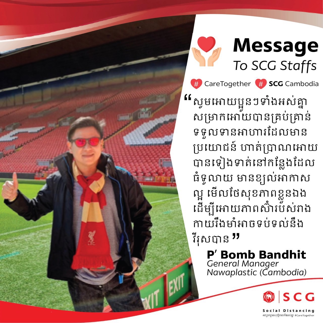 ถามพี่บอมว่าแล้วแบบนี้คิดถึงบ้านบ้างมั้ย พี่บอมบอกว่า คิดถึงก็สามารถบินกลับไทยได้เลยที่บริษัทมีตั๋วให้กลับบ้านปีละ 8 ครั้ง และยังมีตั๋วให้ครอบครัวมาหาที่กัมพูชาได้อีกปีละ 2 ครั้ง ทำให้ยังมีเวลาได้อยู่กลับครอบครัว